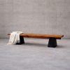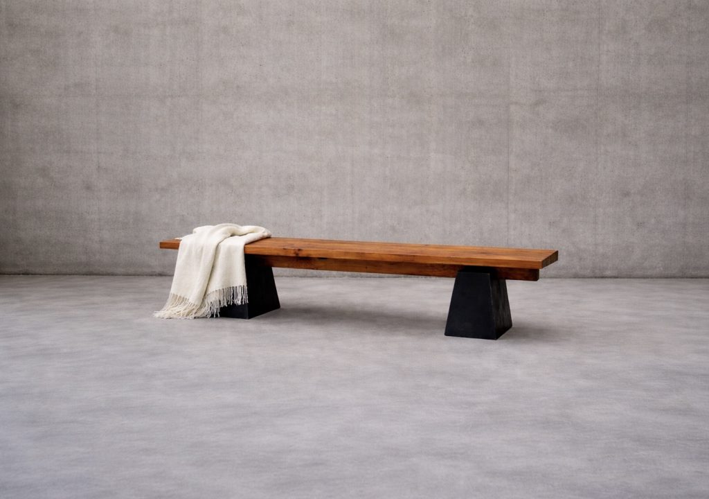 Banca de roble hualle recuperado, con patas en forma de pirámide pintadas negras, que con su viga central elevada, le da una sensación de flotabilidad a la cubierta.